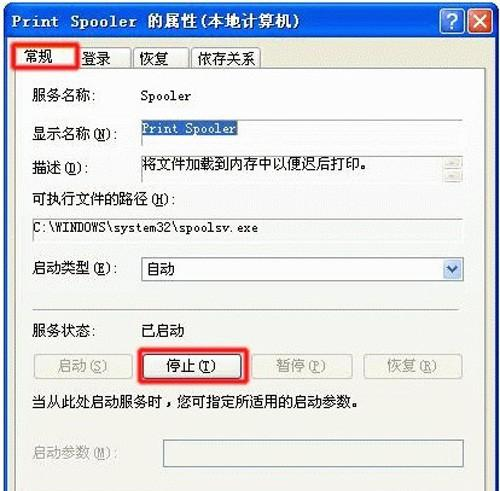 单击Print Spooler后弹出小窗口里,在常规选项下找到"停止"按钮并点击,然后点击确定关闭小窗口。