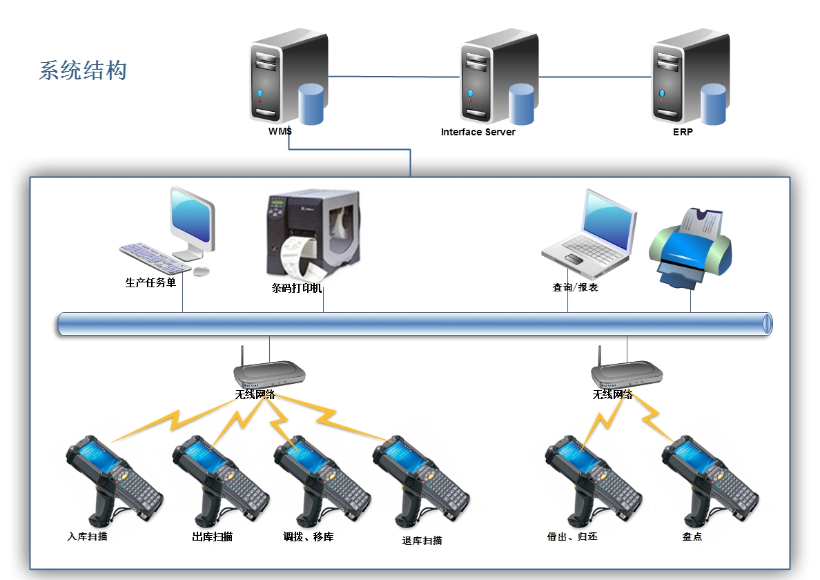 - 1.1.2、WMS mobiles移动手持终端软件:入库扫描、出库扫描、调拨、移位、退库扫描、借出归还扫描,盘点、库位查询、数据查询、条码追】查询。