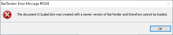 使用BarTender Designer打开文档文件时,出现错误消息#3324