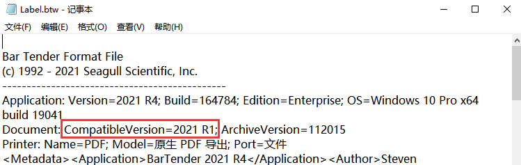 2:使用记事本打开标签文档后,您将看到CompatibleVersion,它指示打开此文件所需的bartender版本(或更高版本):