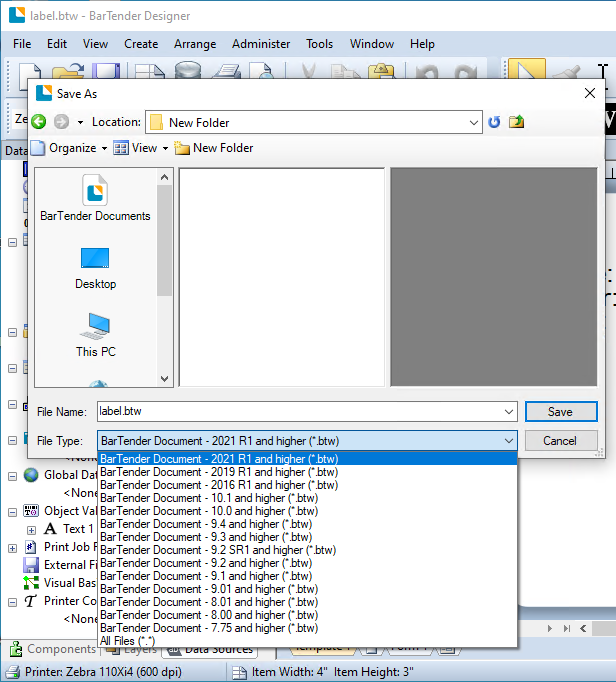 3:使用受支持版本的BarTender Designer打开标签文档,然后转到文件>另存为,并选择希望此标签文档向后兼容的BarTender版本: