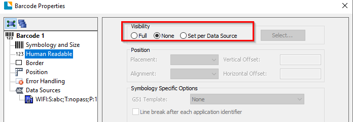 此外,在这种情况下隐藏代码的可读性比较好,可以在条码属性中的‘可读性>可见性’中完成。