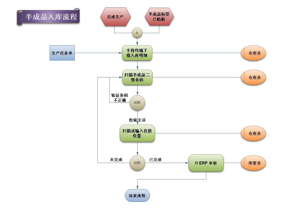入库时,输入生产任务单号(如半成品入库单据来源为:生产任务单),下载生产任务明细,扫描产品标签条码,如有多项,重复扫描,直接到完成,完成半成品入库;
