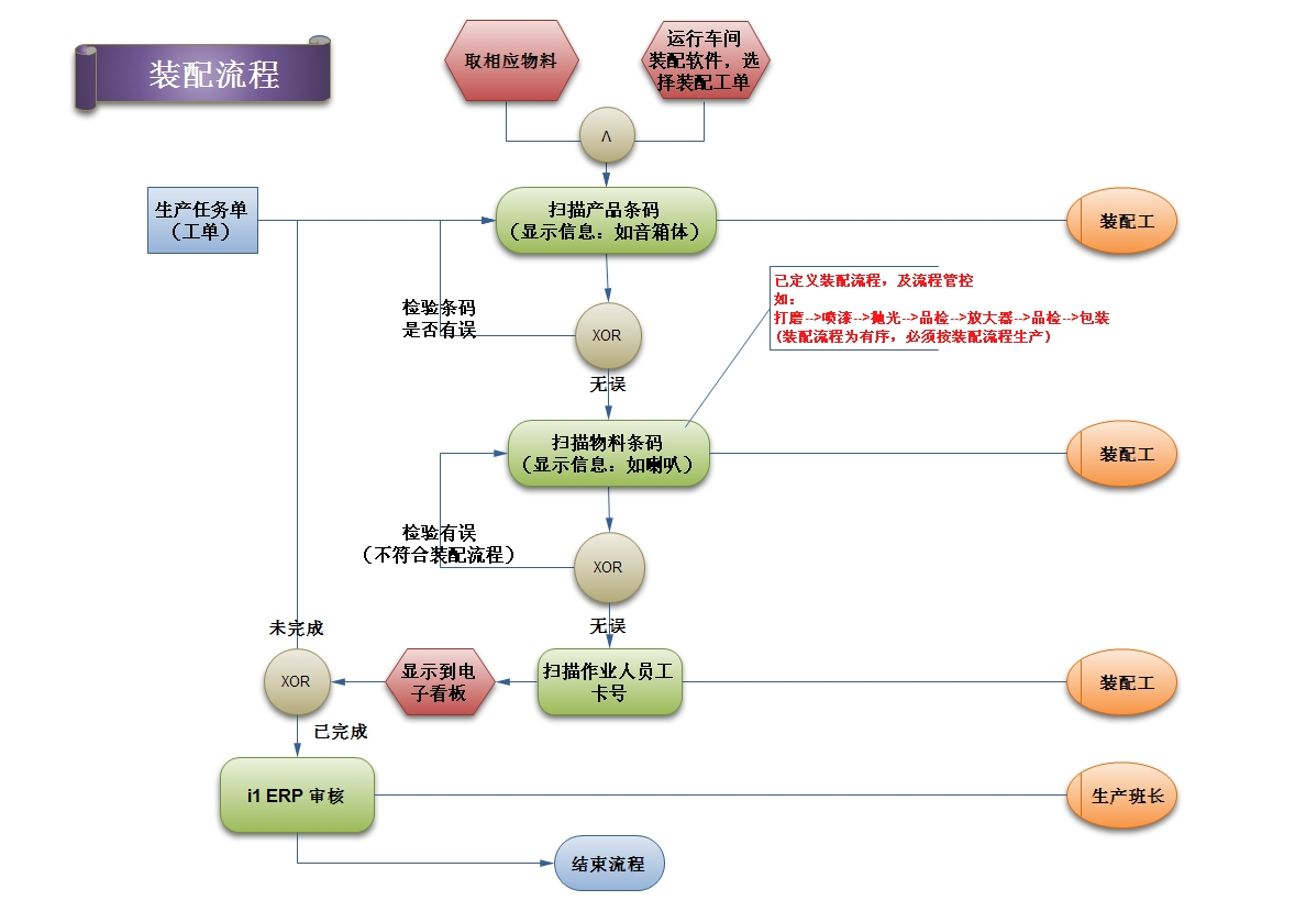 当完成一个工序后,用户先扫描产品条码(如音箱体S/N码),再扫描物料条码(如喇叭S/N码),如需记录作业人员,只需要再次扫描作业人员工卡号条码即可(如作业人员所在工位是固定的,也可预先设置好作业人员,可减少操作步骤),完成一项装配。