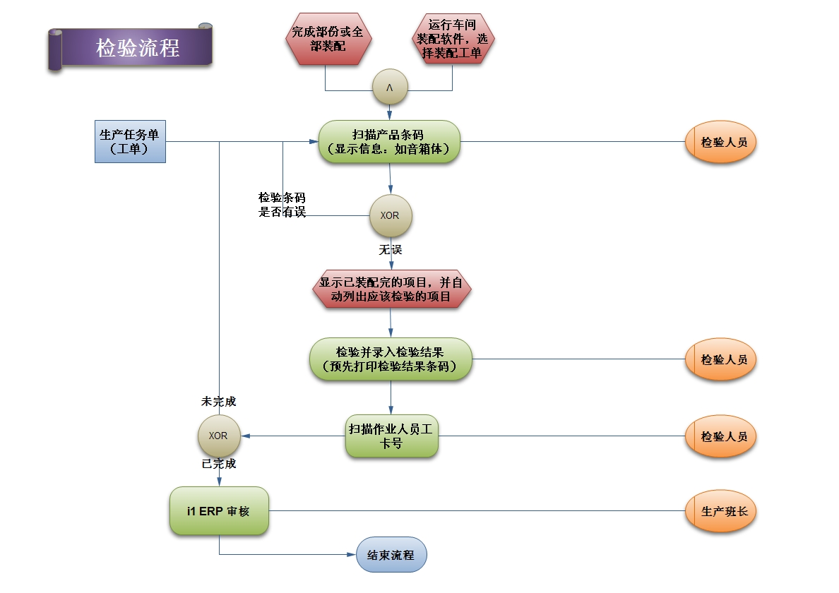 当完成一个或多个工序后,检验人员先扫描产品条码(如音箱体S/N码),显示已装配完的项目,并根据生产管控流程自动列出检验项目(如无检验项目,提示用户),检验人员将检验结果录入系统(也可预先打印检验结果条码,直接扫描相应检验条码),最后扫描检验人员,完成。