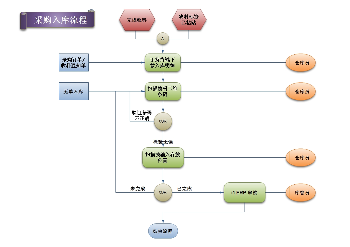 根据入库计划或采购单,输入相应单据编号(支持无单入库),下载入库明细,扫描物料条码(如扫描的条码有误,或不在计划中,及时提示不允许入库原因),扫描或输入存放位置(如无具体货架规划以仓库为存放位置),直到完成所有项,完成物料入库,自动生成一张入库单。