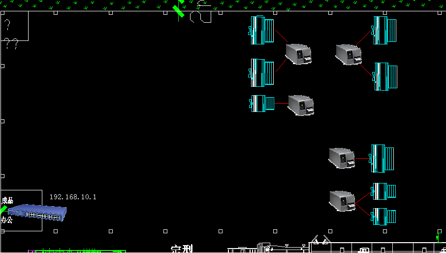 产线部署5台条码打印机,相近两台卷布机共用一台条码打印机,用有线网络连通,220V电源供电。网络地址为:192.168.10.20、192.168.10.21、192.168.10.22、192.168.10.23、192.168.10.24