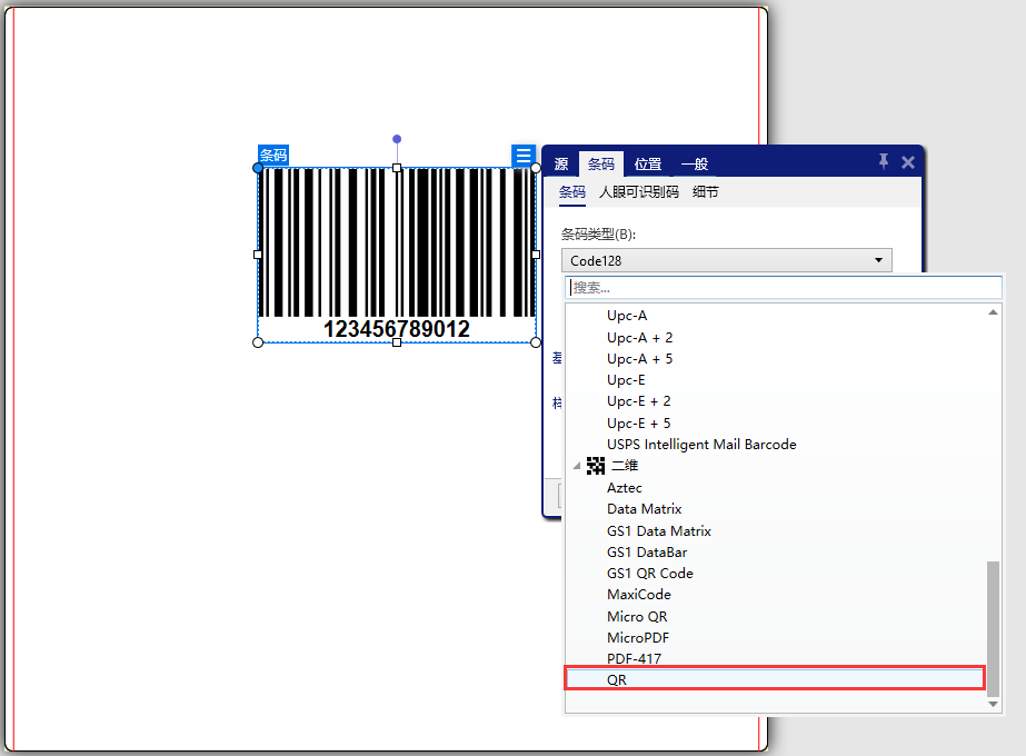 双击条码打开条码属性对话框,转到条码页签,在条码类型那里下拉,选择