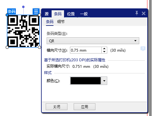拖动二维码四个顶角的锚点或者修改条码属性的横向尺寸可以改变二维码的大小。
