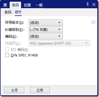 点击细节子页签,可以设置二维码的符号版本、纠错级别和编码方式等选项。