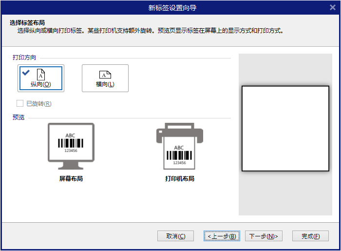 4.选择标签布局,可选择横向或者纵向布局,预览窗口即时显示屏幕显示和对应的打印机出纸样式。