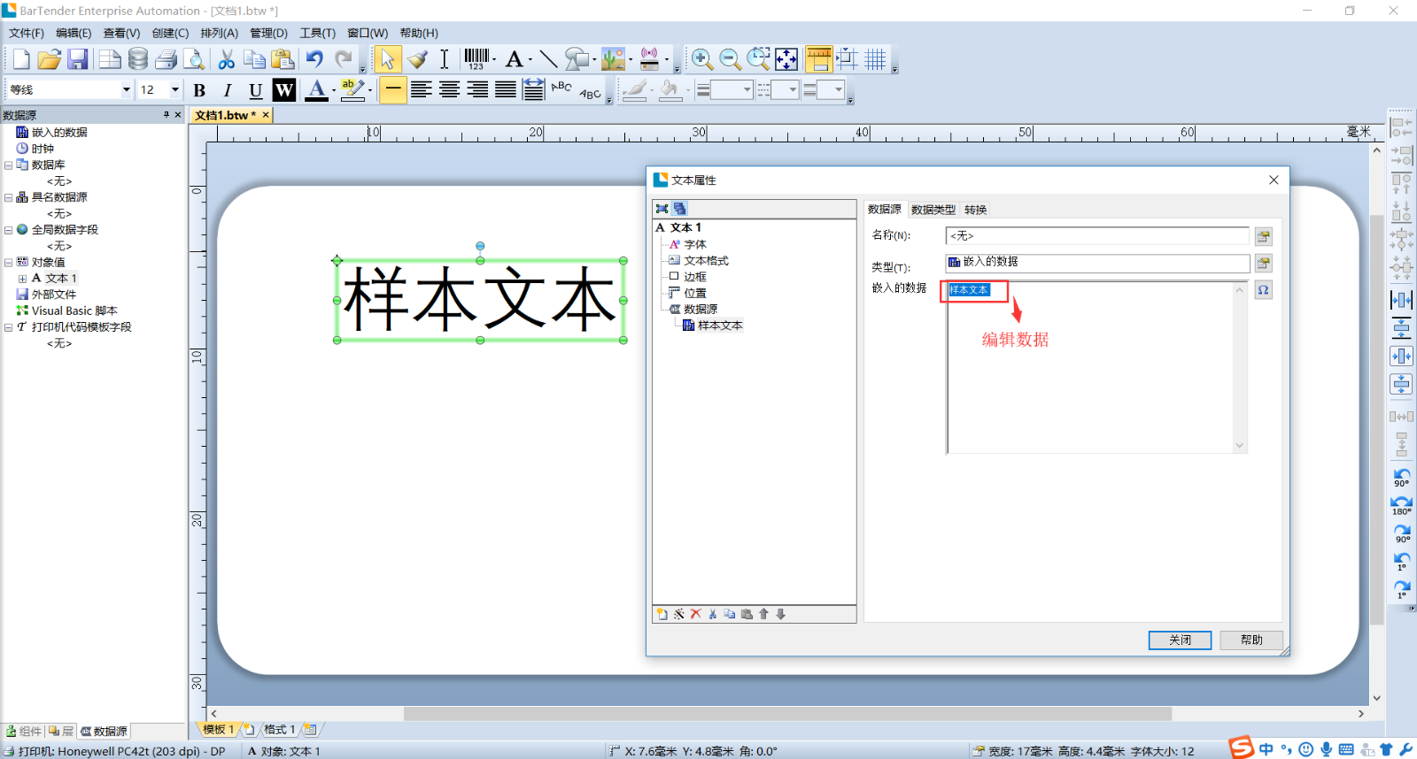 三、双击样本文本边缘,这样可以自动弹出文本属性框,我们可以开始浏览编辑我们所需要的文本数据了
