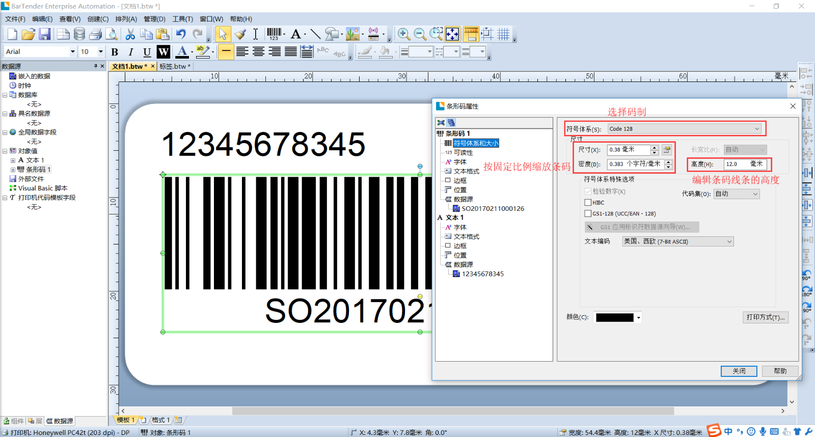 六、鼠标左键双击条码,可以自动弹出条码属性的编辑框,由于如何设置条码的属性的内容比较多,我们将在另外的文章中为大家详细介绍
