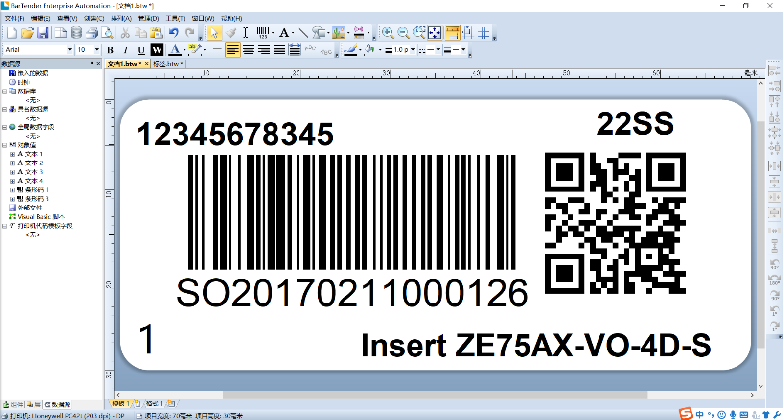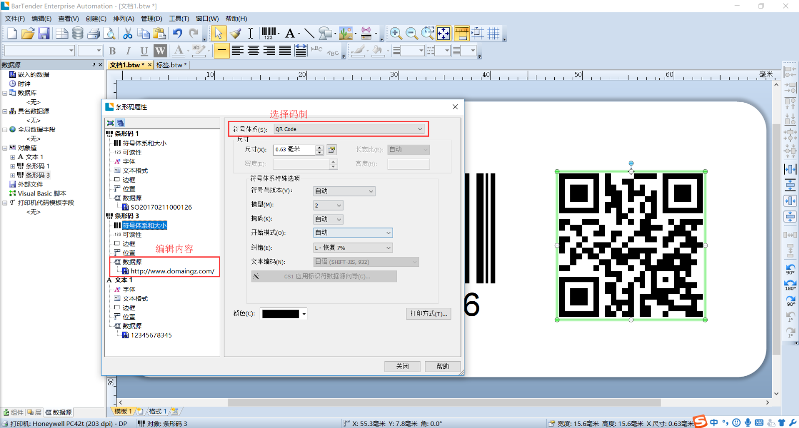 本标签内容的编辑基本包括了我们日常要用到的几个方面:一维条码,二维条码QR码,文字等