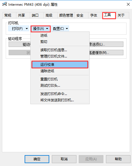 在“设备和打印机列表”里找到PM43的打印机图标,右键打开“打印机属性”对话框,转到“工具”标签栏下,点击“操作”下垃按钮的“运行校准”,就会向打印机发送运行校准的命令。