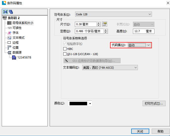Bartender默认设置为”自动“,这意味着它将自动为所选数据选择最有效的代码集。如果需要,您可以通过选择相应选项来选择代码集,也可以手动提供编码条形码所需的所有信息。