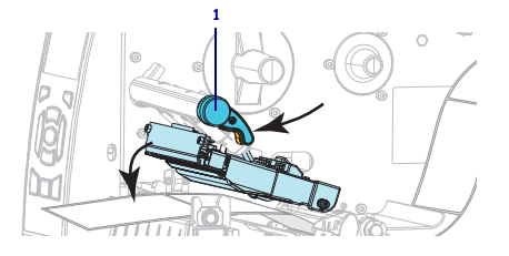 7. 向下旋转打印头开启杆 (1),直到将打印头锁定到位。