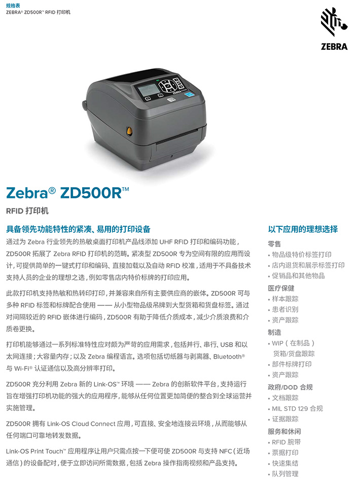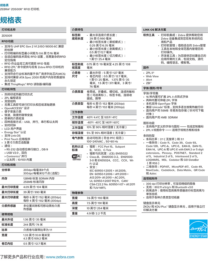 由于 ZD500R 采用了与 Zebra 的行业领先 RFID 打印机/编码器一样的创新技术,因此现有应用也可以轻松地运用该打印机。ZD500R 支持新一代嵌体并提供 802.11 a/b/g/n 无线和 Bluetooth® 连接。