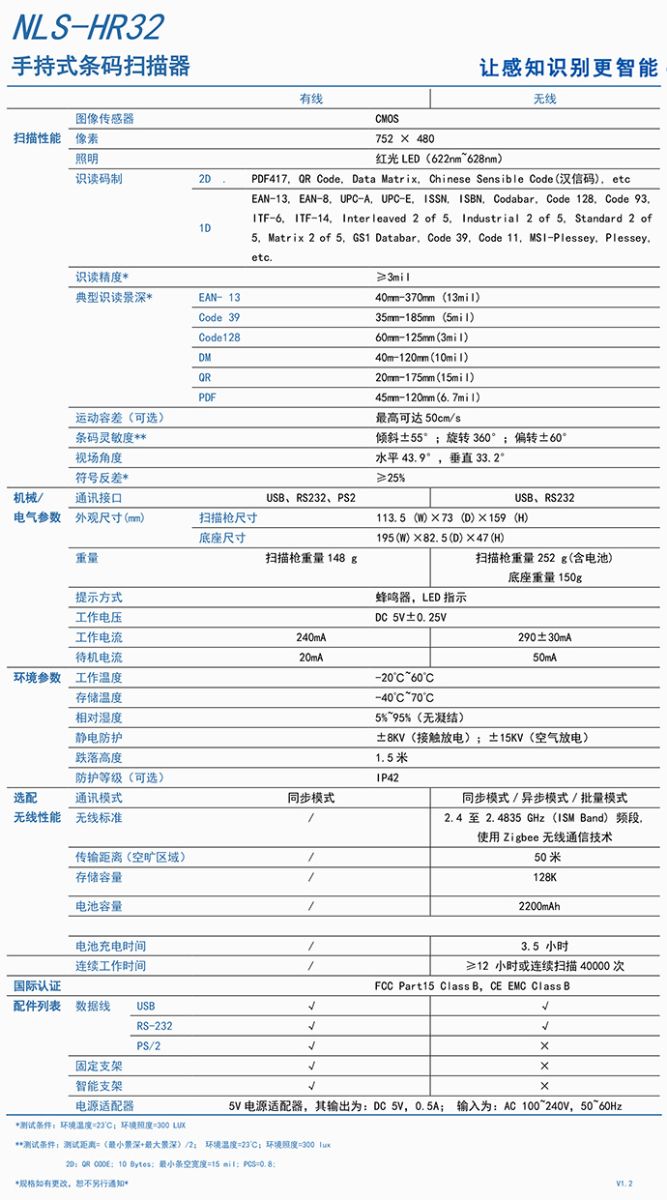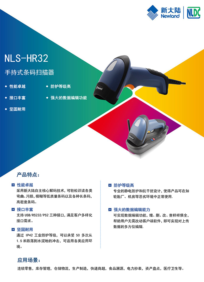 NLS-HR32是新大陆旗舰型二维产品,具备有线和无线两种配置;采用了全球首创的新大陆解码芯片,可识读各类一维条码和主流二维码(QR Code,DataMatrix,PDF417,汉信码等);NLS-HR32支持USB、RS-232和PS2等接口,结实耐用,具有良好性价比,非常适合在超市、商场和仓库物流等环境中应用。