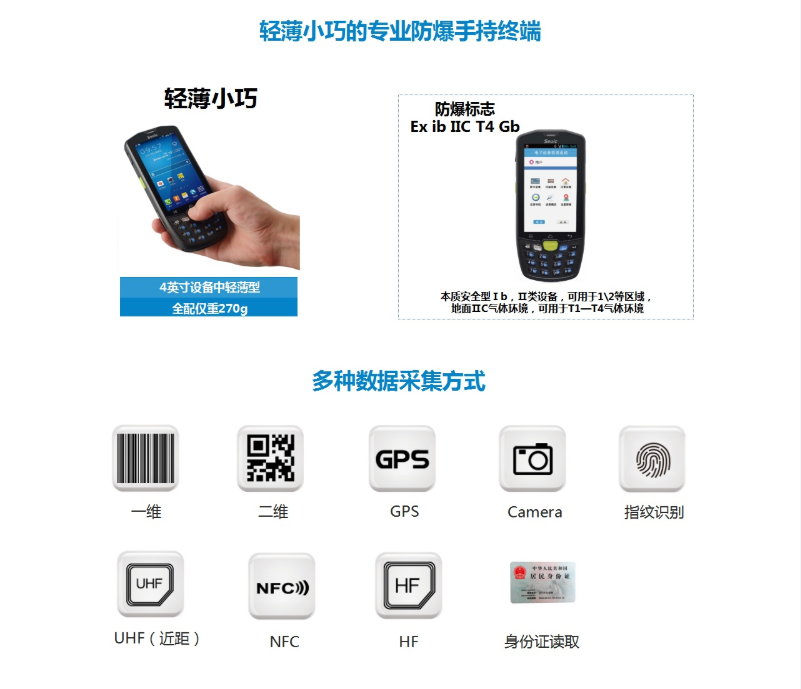 东集 在(全新)AUTOID9的高可靠性基础上,倾力研制出防爆手持终端PDAExpda1701,可广泛应用于石油石化、天然气、化工、冶金等行业工厂爆炸性气体、粉尘现场,实现巡检、现场出入库管理、现场物资管理等应用。