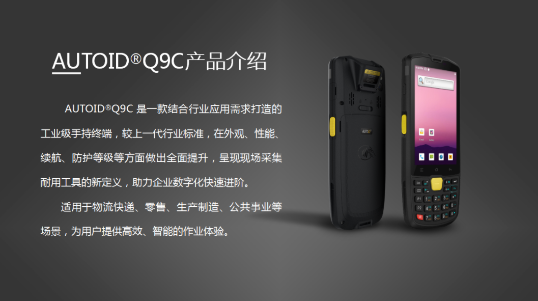 东集 AUTOID ®Q9C是一款结合行业应用需求打造的工业级手持PDA手持终端,较上一代行业标准,在外观、性能、续航、防护等级等方面做出提升,呈现现场采集耐用工具的新定义,助力企业数字化快速进阶。适用于物流快递、零售、生产制造、公共事业等场景,为用户提供智能的作业体验。