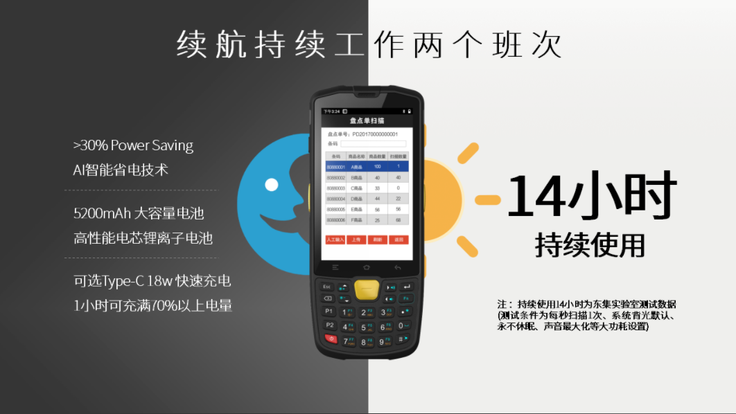 电源:可拆卸3.85V 5200mAh锂离子充电电池;侧面接口:type-c接口,支持快速充电,智能识别PC及充电器;底部接触式尾插接口:支持5V/2A充电 ;备份电:可选