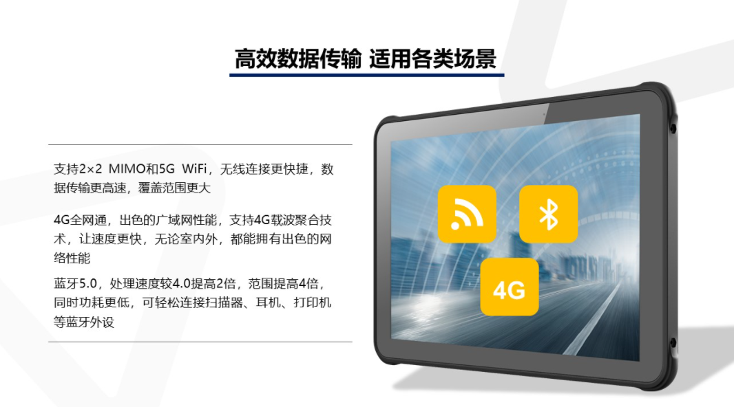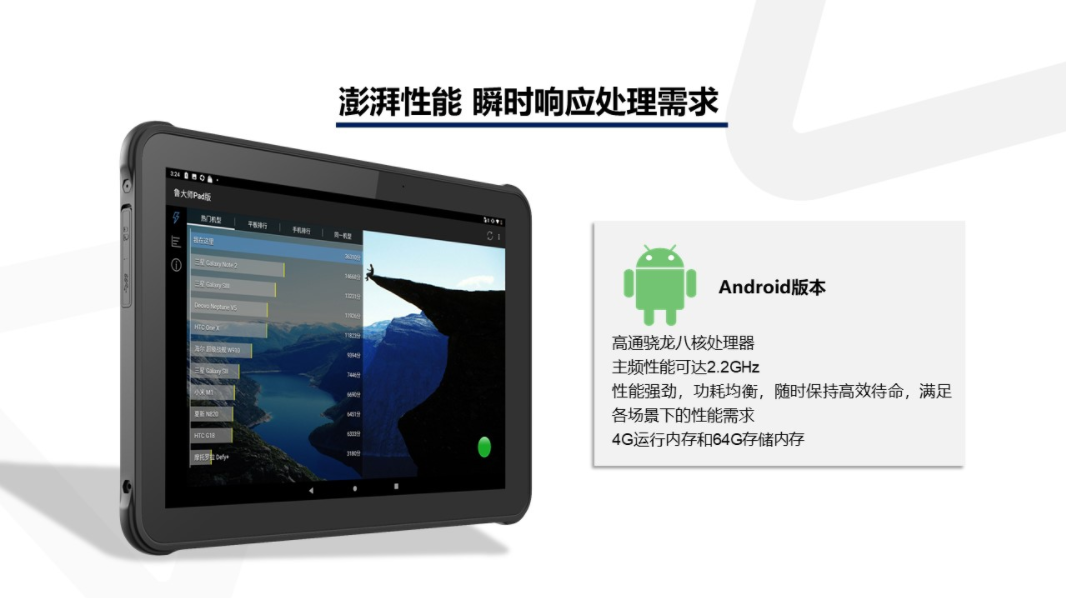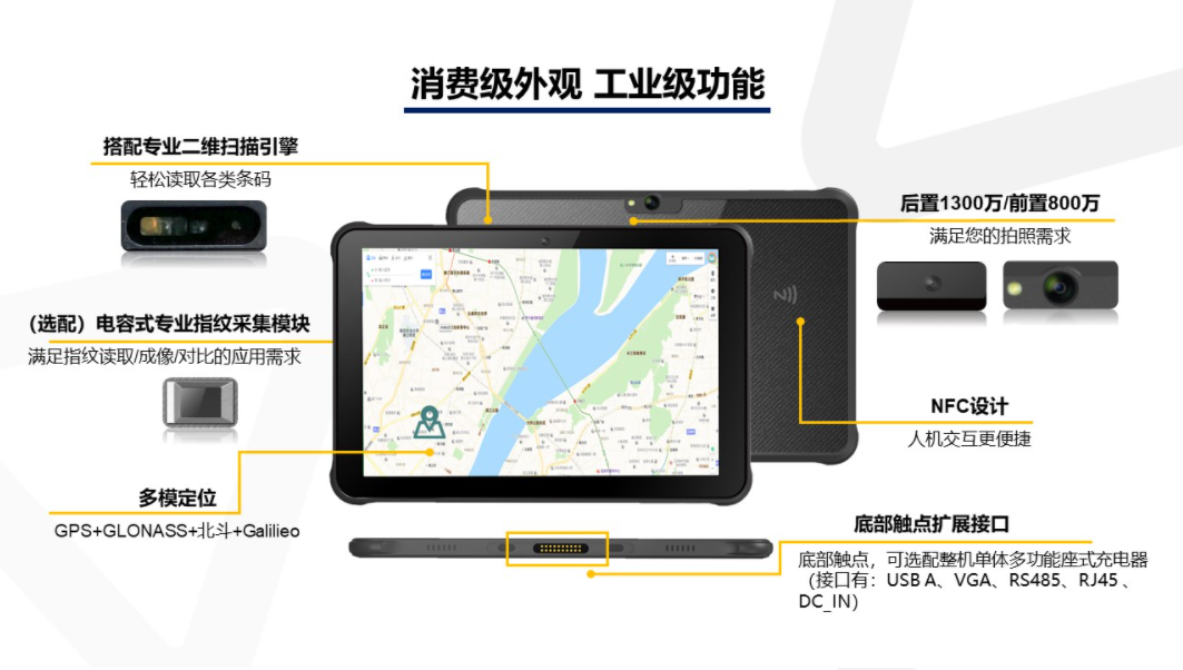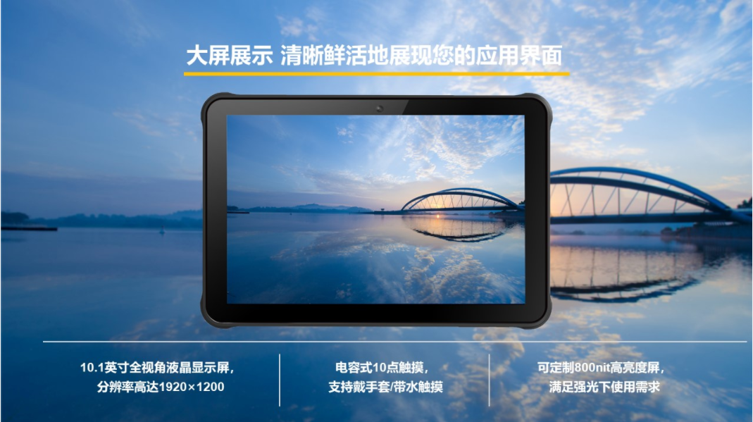 显示屏幕:10.1英寸全视角液晶显示屏,电容式10点触摸,支持戴手套/带水触摸;分辨率1920×1200,普通亮度370nit(可定制高亮800nit)