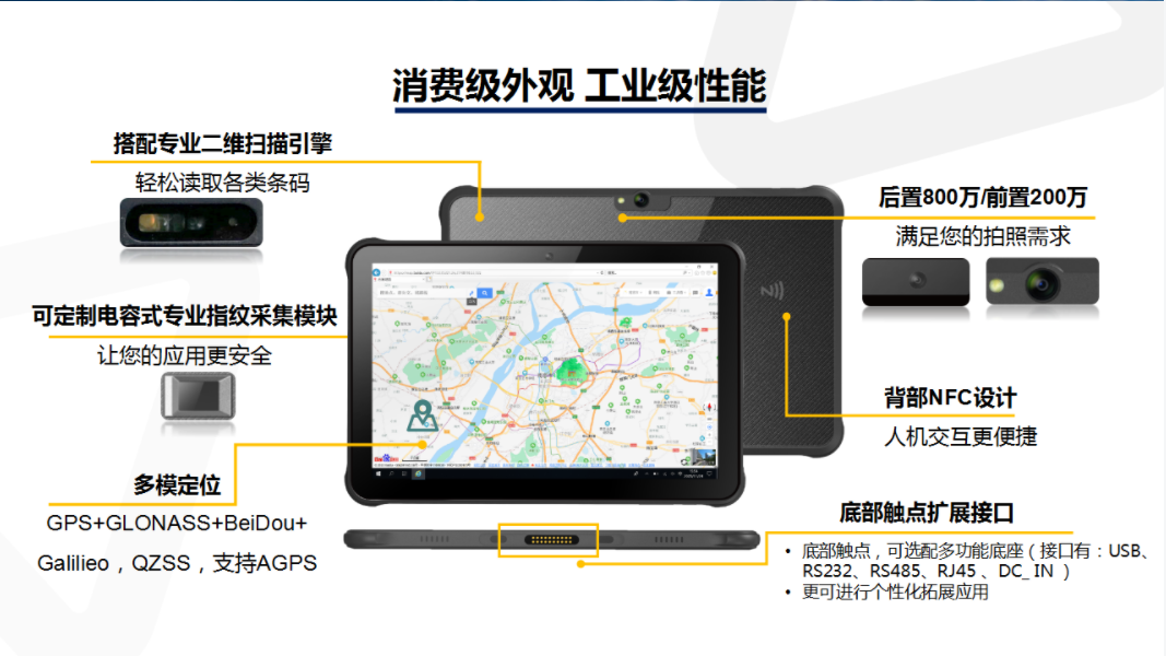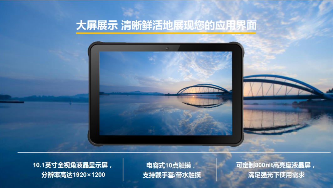 显示屏幕:10.1英寸全视角液晶显示屏,电容式10点触摸,支持带水触摸;分辨率1920×1200,普通亮度
