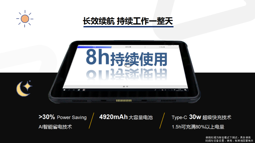 电源:底部触点接口DC IN,最大输入功率27W;不可拆卸7.7V锂离子充电电池,典型值 5070mAh,额定值 4920mAh;USB TYPE-C接口,支持PD快充