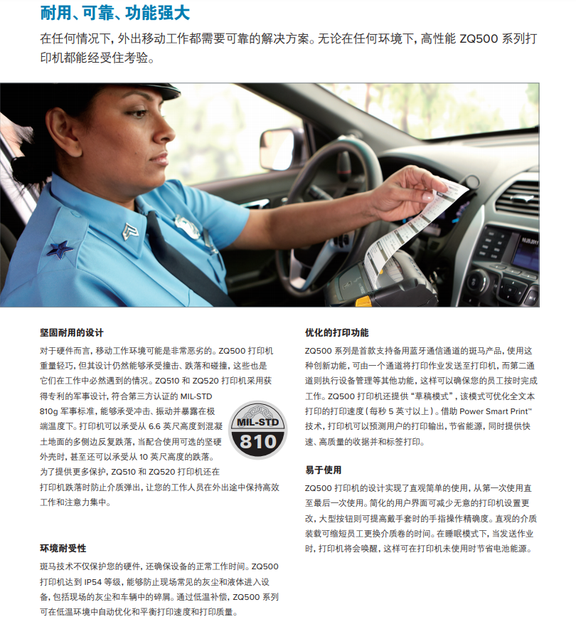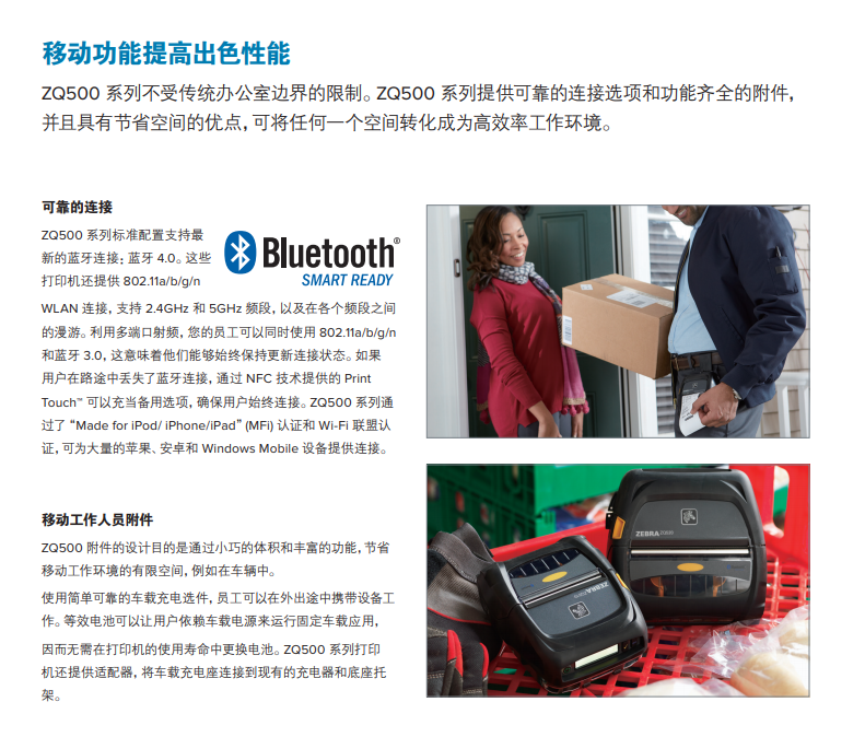 ZEBRA ZQ500系列移动打印机坚固、耐用,它们在业内最宽的工作温度范围内运行,并且可以承受从高达 6.6 英尺的高度反复跌落到混凝土上。打印机采用获得专利的军用级设计,即便在最恶劣的环境下也提供出色的耐用性和可靠性。无线连接(WIFI/蓝牙),热敏打印,交通、物流等移动办公的最佳伙伴。