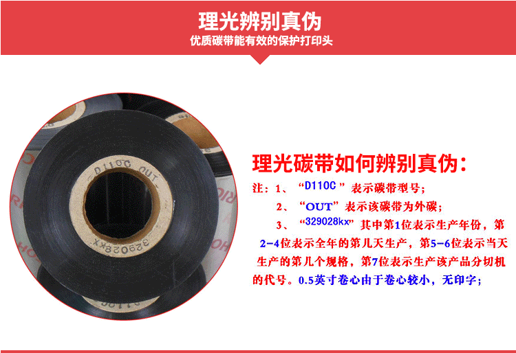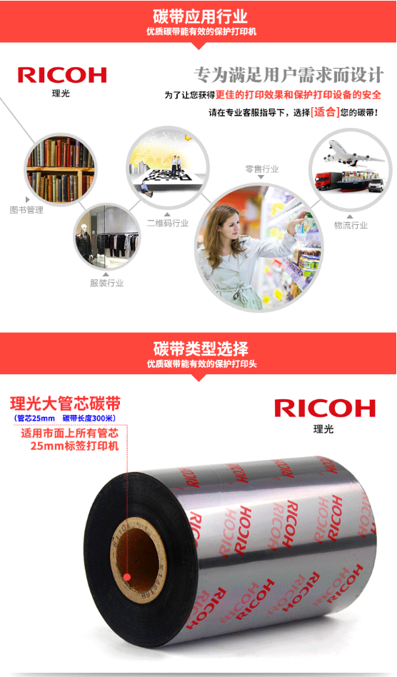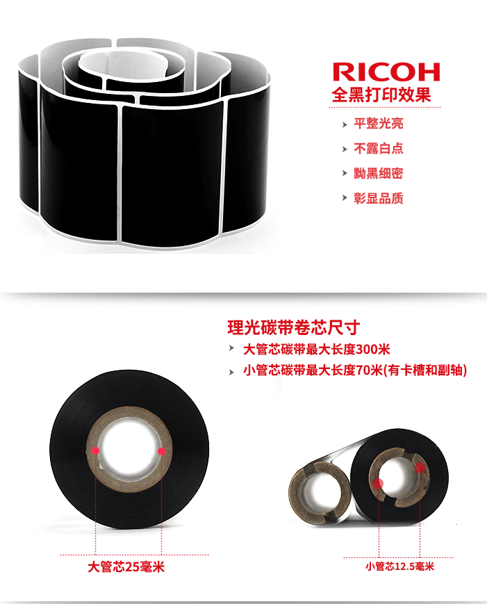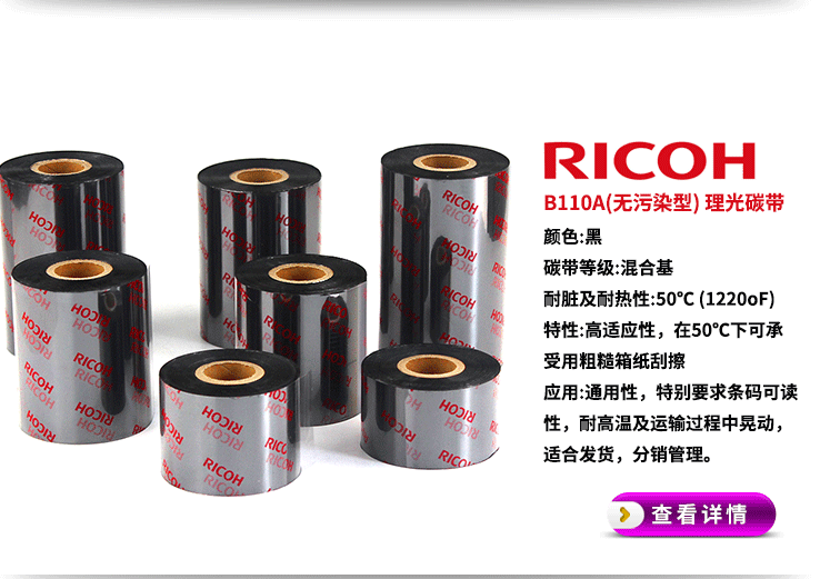 理光(RICOH) B110A 混合基碳带,打印清晰度高,高度分辨率适合打印标准及旋转条形码。防静电背涂层,有效保护打印头。配方经过专门设计,以实现良好的耐刮性、抗污性,以及对大多数温和化学品的耐受性。适合发货标签,货架管理、服装及织物分销管理标签等。
