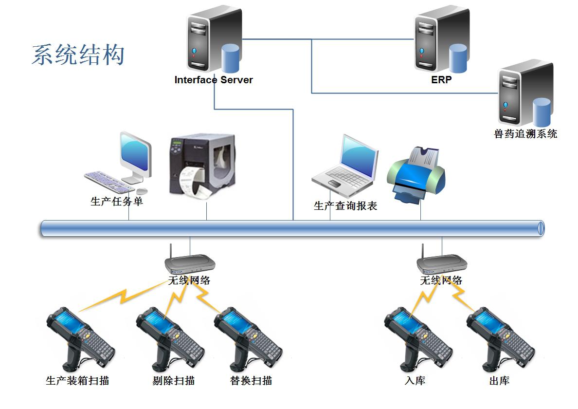 BTS系统实现与ERP对接,实现生产入库单、采购入库单、销售出库单、其他出库单对接,并生产过程、仓库管理过程进行过程监控、条码数据采集,实现可追溯化管理。同时与ERP、国家兽药追溯系统接口,实现在一套系统上操作,完成两套系统所要的数据。