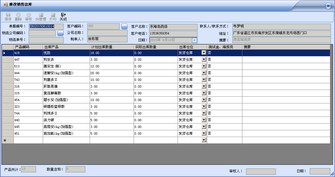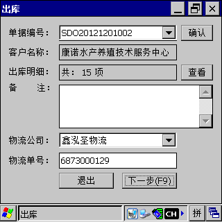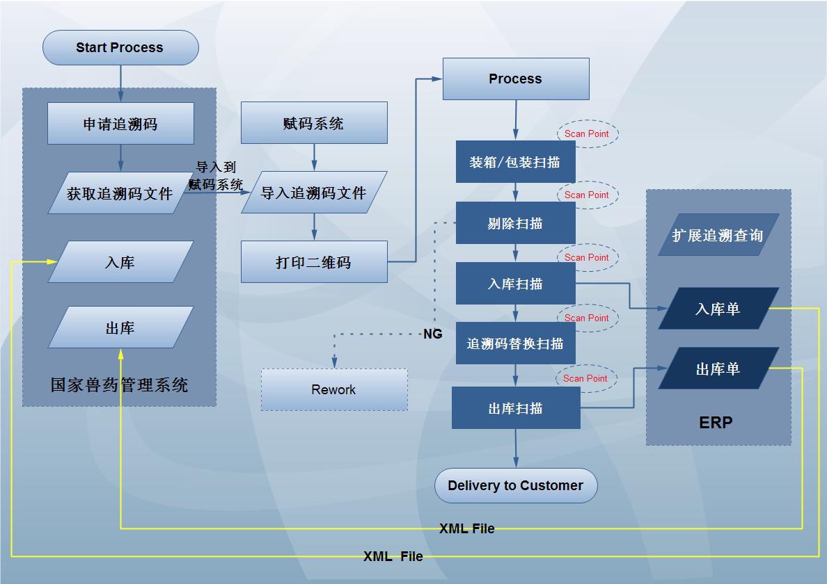 流程:ERP 创建出库单 à 打印出库单 à 手持终端下午出库单 à 扫描出库à 更新ERP库存 à 导出国家兽药追溯系统需要的出库文件,并导入。