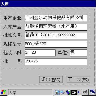 入库流程:ERP 创建入库单 à 【打印入库单】 à 手持终端下载入库单 à 入库扫描 à 更新ERP实际入库数据 à 导出国家兽药追溯系统需要的入库文件,并导入。